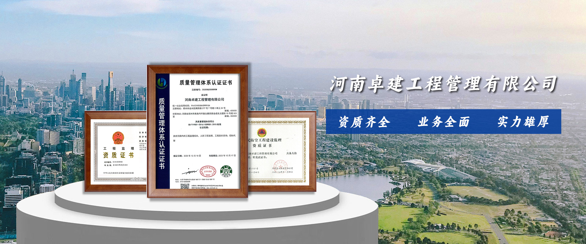 河南卓建工程管理有限公司(前身名為河南卓建建筑工程監(jiān)理有限公司)是經(jīng)鄭州市工商行政管理局批準(zhǔn),成立于2011年,經(jīng)營業(yè)務(wù)范圍包括建筑工程監(jiān)理、工程監(jiān)理、工程項(xiàng)目管理、招標(biāo)代理、造價(jià)咨詢等,具有工程監(jiān)理綜合資質(zhì)、人防工程丙級(jí)資質(zhì)、造價(jià)咨詢資質(zhì)乙級(jí)。公司已通過質(zhì)量管理體系認(rèn)證、職業(yè)健康安全管理體系認(rèn)證、環(huán)境管理體系認(rèn)證,公司是河南省監(jiān)理協(xié)會(huì)會(huì)員單位。